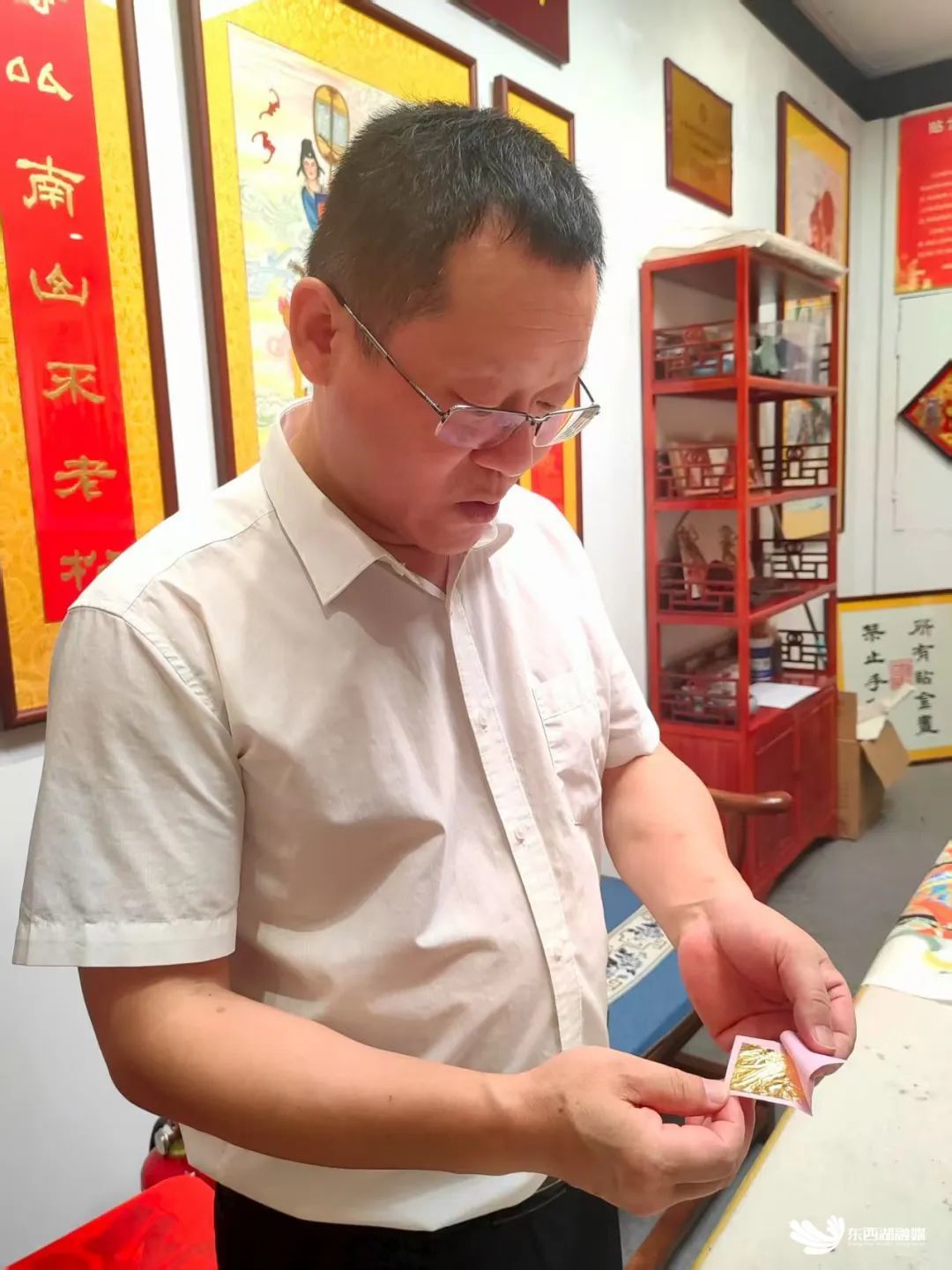 许华波介绍年画贴金的金箔。