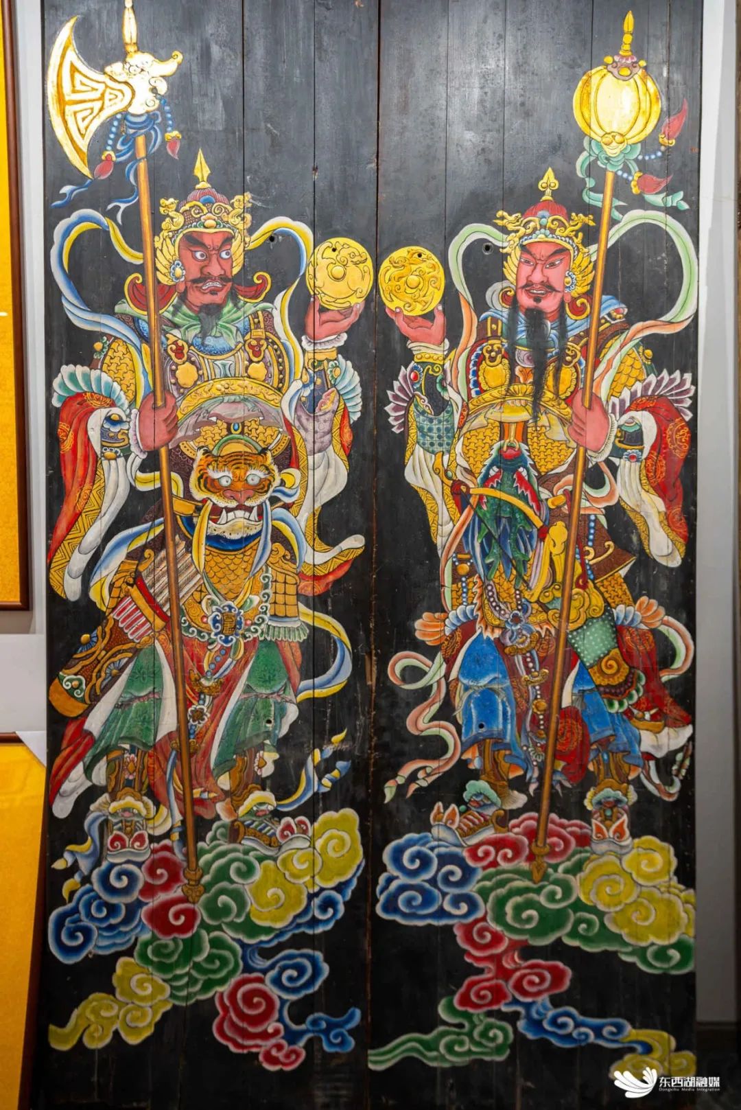 在汉吉福展厅,三组历经百年沧桑的朱漆木门格外显眼,每扇高达两米的巨型门板上,以工笔重彩绘制的门神年画如穿越时空的武士巍然伫立——秦叔宝手握双锏怒目圆睁,尉迟敬德横鞭而立须发飞扬,人物与真人几乎与真人同比大小,衣袂褶皱间仿佛能听见沙场烈风。